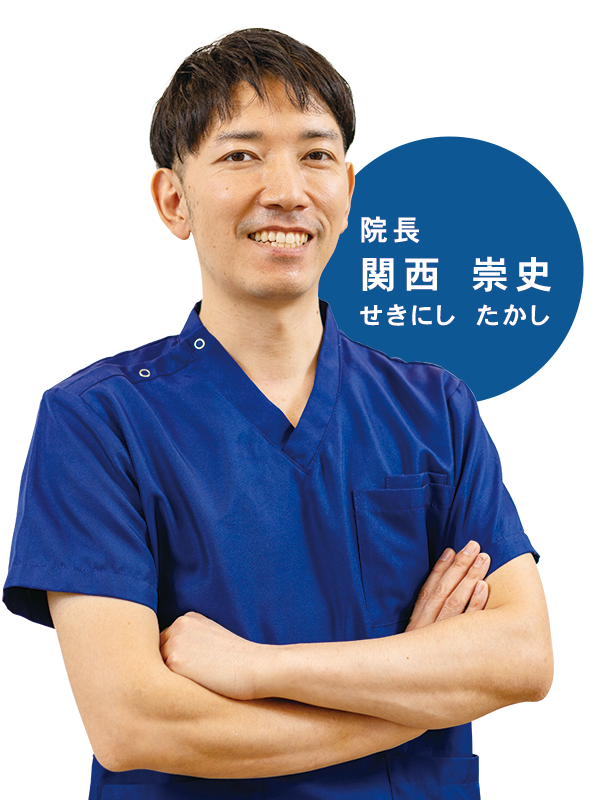 はじめまして、院長の関西崇史です。生まれ育った京田辺で開業するにあたり、「10年先も20年先も地域の方に愛される歯科医院」にしたいと考えております。「怖い・痛い」といった歯科へのマイナスイメージを取り除き、安心して通える環境づくりと、丁寧なコミュニケーション、検査結果やご希望をもとにした個別の治療プラン、そしてその後の予防へとつなげることを使命としています。皆様の笑顔あふれる毎日をサポートいたします。