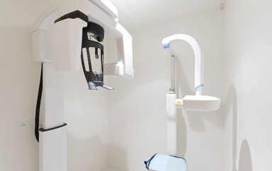 放射線量がとても少なく立体的に口の中のデータの取得ができる歯科用CTを導入しています。こちらは歯科3種の神器と言われているひとつで、導入している医院は多くはないので貴重です。インプラントや歯周病、難しい抜歯などにも利用されているようです。また、治療の際には拡大鏡(患部が大きく見えるメガネ)も利用しているため、肉眼では見えないところも見ることができ、治療の精度を高められるそうなので安心ですね。