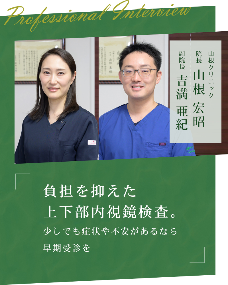検査を億劫に感じてしまう人は多いようですが、1~2年に一度、少し頑張って検査を受ければ大きな安心が得られます。特に内視鏡は検査精度が高く、異変の早期発見に有力です。少しでも苦痛を除き、楽に検査を受けられるようにと心を砕いている山根院長と吉満副院長のお話を聞いて、検査への不安が軽くなり、前向きに取り組めそうだと感じました。