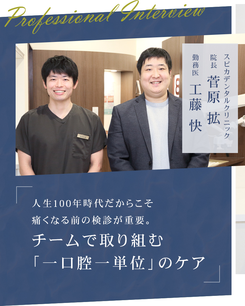 むし歯や歯周病の予防には、痛みが出る前からのケアと3カ月ごとに定期検診に通うことが重要とされている。しかし、歯は痛みが出るまで放置される傾向にあり、気づいたときには悪化してしまっているケースが少なくない。「歯は外界にさらされやすく、定期的なケアが特に重要な部位」と話すのは、山形市「スピカデンタルクリニック」の菅原院長。今回は菅原院長と工藤医師に、予防治療の重要性や診療の流れ、セルフケアのポイント、「一口腔一単位」の理念について話を伺った。