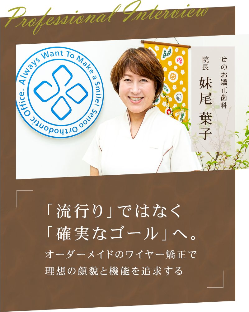 歯科矯正治療が一般化を見せ、手軽さを謳う装置が広く普及する現代において、あえてその時流に迎合せず、伝統的かつ高度な技術を要する「ワイヤー矯正」のみに特化して日々の診療に向き合う歯科医院。それが、せのお矯正歯科です。この歯科医院の院長である妹尾葉子先生は、既製品のワイヤーに頼るのではなく、患者さん一人ひとりの歯牙の形態や顎骨のバランスに合わせて0コンマ数ミリの単位でワイヤーを屈曲させる「スタンダードエッジワイズ法」という、いわばオーダーメイドとも呼べる技術を駆使して、数多くの複雑な症例をゴールへと導いてきた歯科医師です。近年、SNS等を通じて過剰な情報に触れ、自身の顔貌(Eラインや人中など)の変化に対して強い不安を抱いて来院する患者さんが増加傾向にある中、初診のカウンセリングに約1時間という長さを設け、決して理想論だけを語らない徹底した対話を重んじられているそうです。「矯正治療は悪いところを回復させるのではなく、新しい形を創る医療である」という哲学と、患者さん自身の人生に長期的な責任を負うという深い覚悟。今回は、機能美と審美性を両立させる職人としての矜持と、対話を重んじる温かな眼差しを併せ持つ妹尾院長に、矯正治療の本質と真髄についてじっくりとお話を伺いました。
